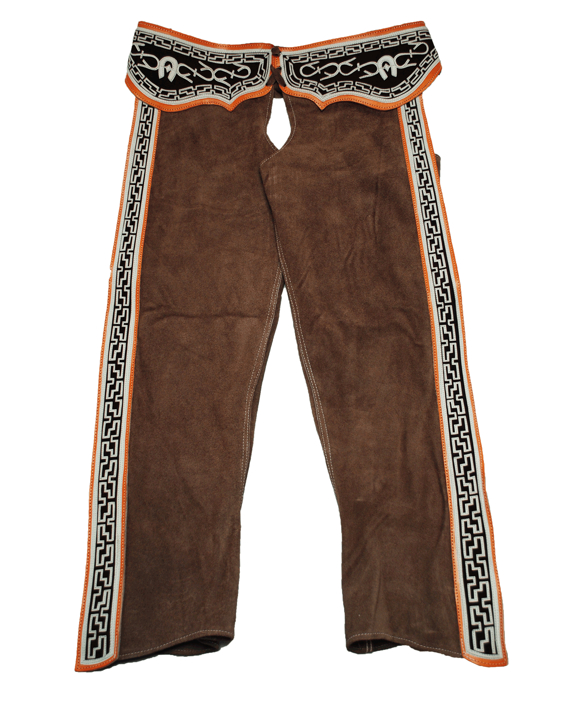 fine full suede leather chaps with leather straps applications, cut in fret and horseshoe figures, handsewn. Fina Caparrera de