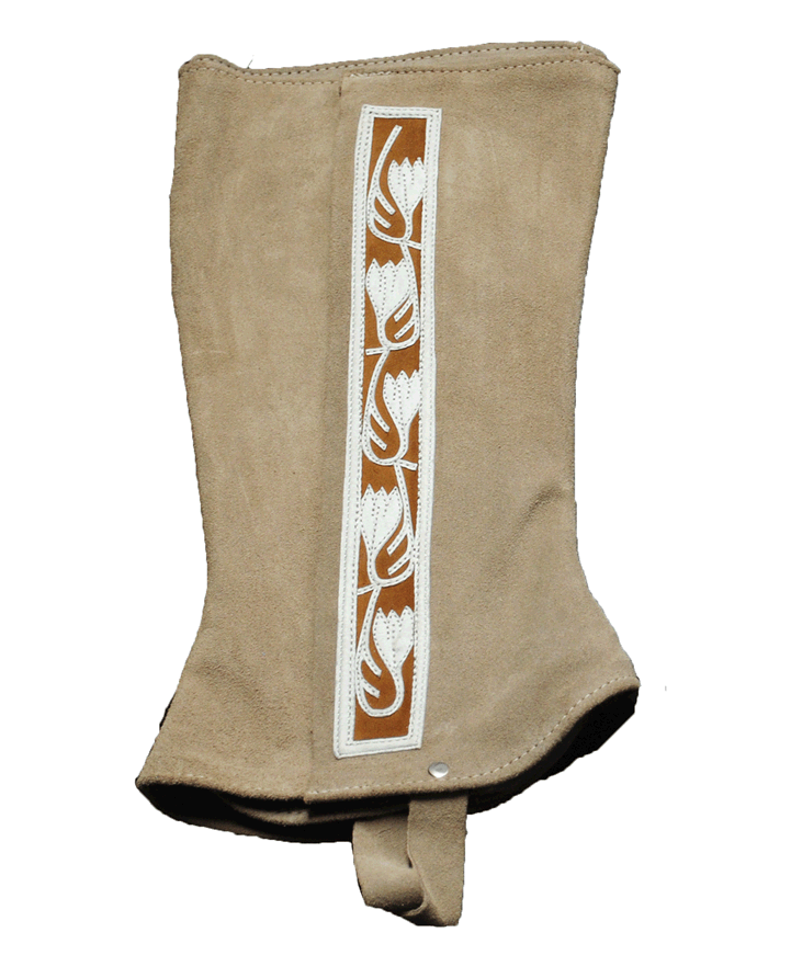 Leather chaps with cut images of flowers in suede with 2 buckles. Polaina de Cuero con imagenes navajeadas de flores en Gamuza de dos hebillas.