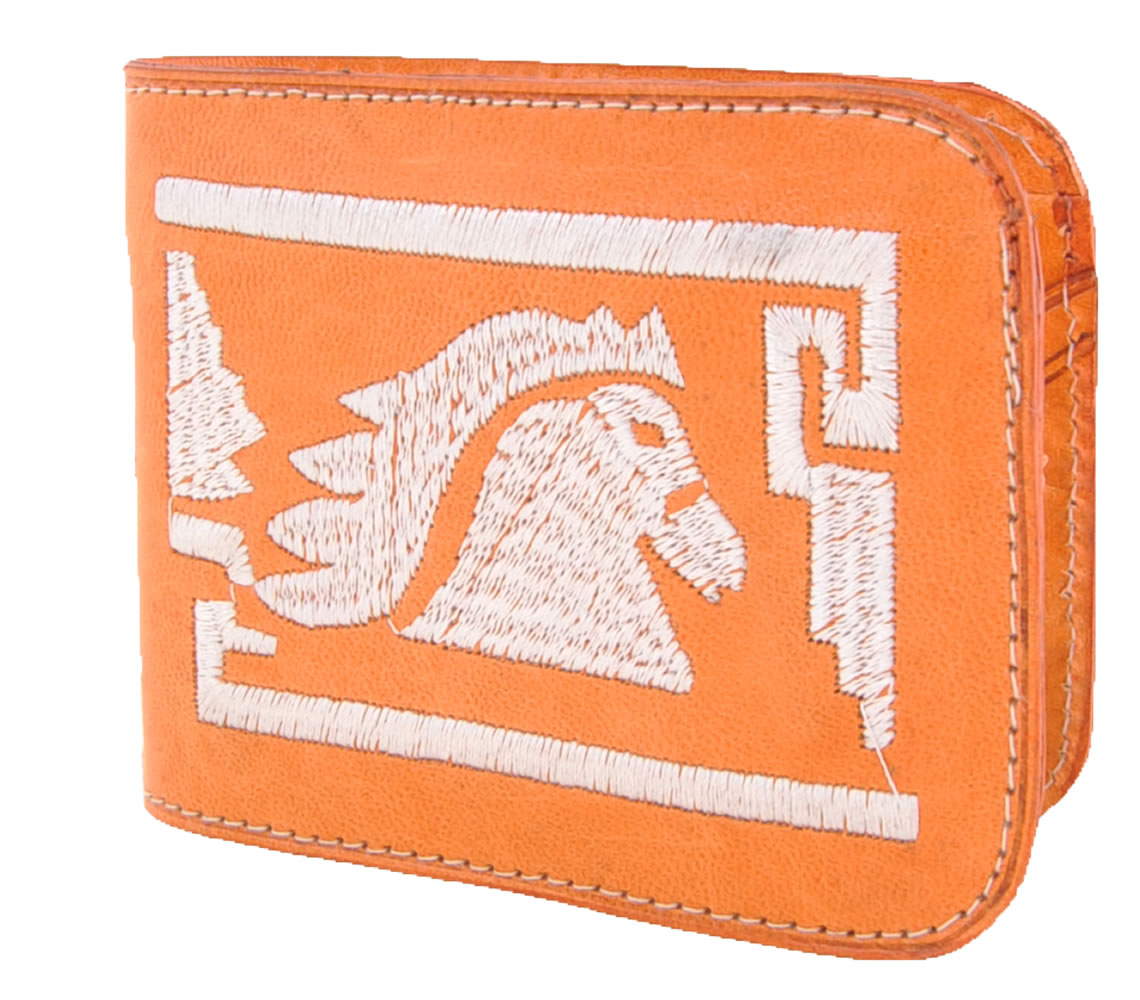 is of a horse head with frets. Cartera fina de cuero de res bordado a maquina la imagen es de una cabeza de caballo con grecas, de un doblez.