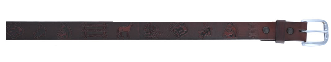 and with metal buckle. Cinto fino de piel de res original hecho a mano de color cafe, grabado con figuras de animales de rodeo, aceitado, suavizado, y