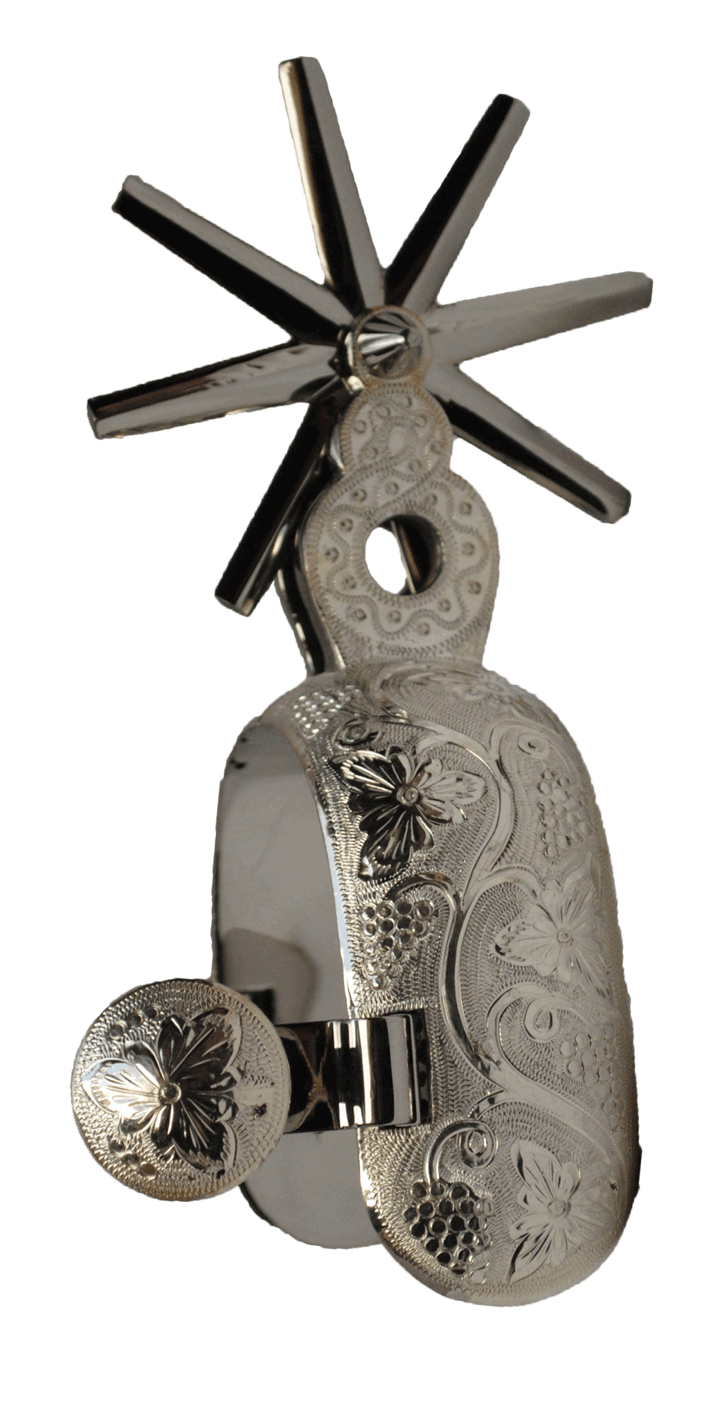 Espuela fina charra de acero inoxidable hecha a mano, estilo colima gigante incrustada y completamente forrada en plata boton en flor de plata grabada con flores y frutas, rodaja grande de estrella.