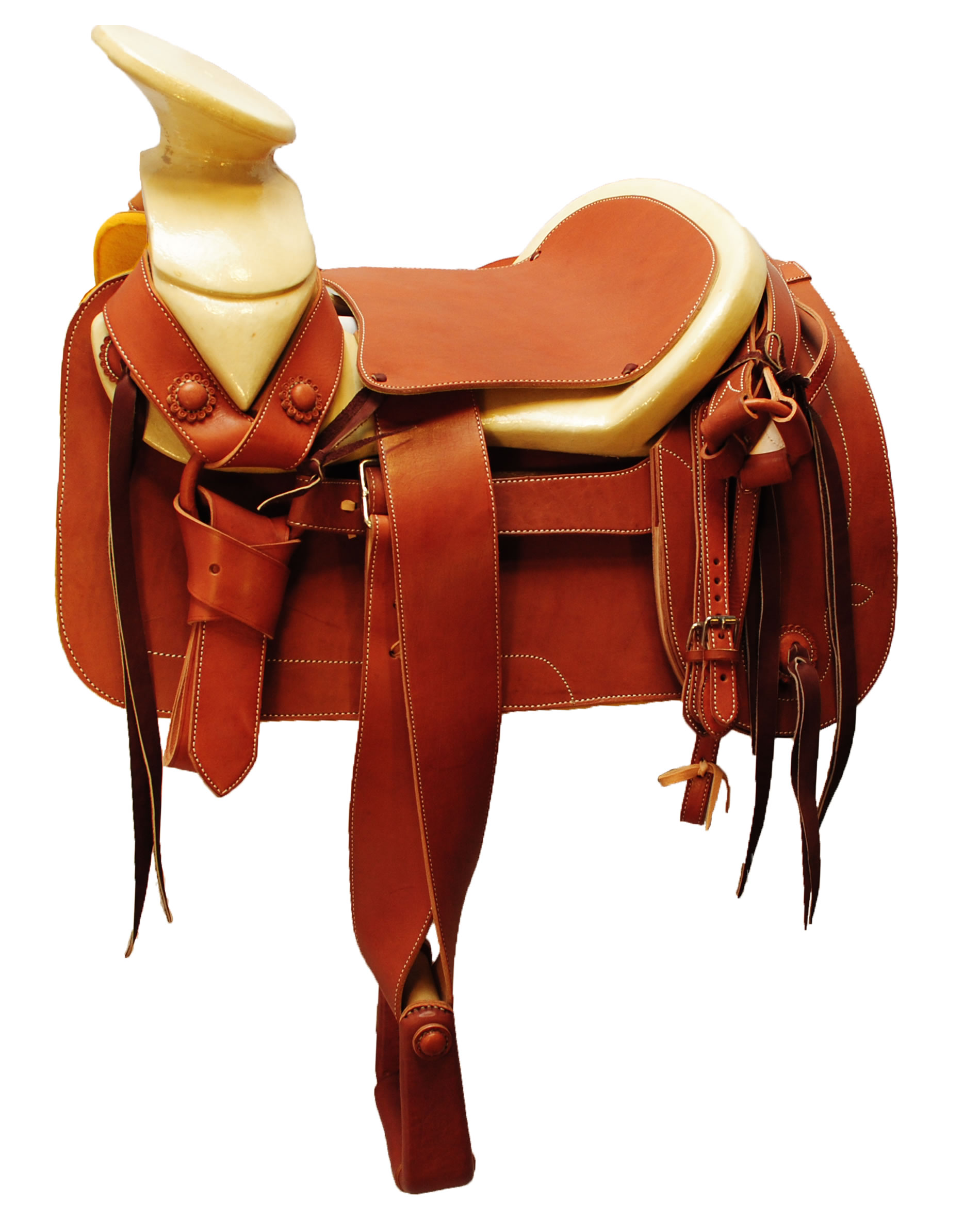 asiento de cuero fina gamuza, fuste de madera regular, botones, estribos y hebillas regulares.