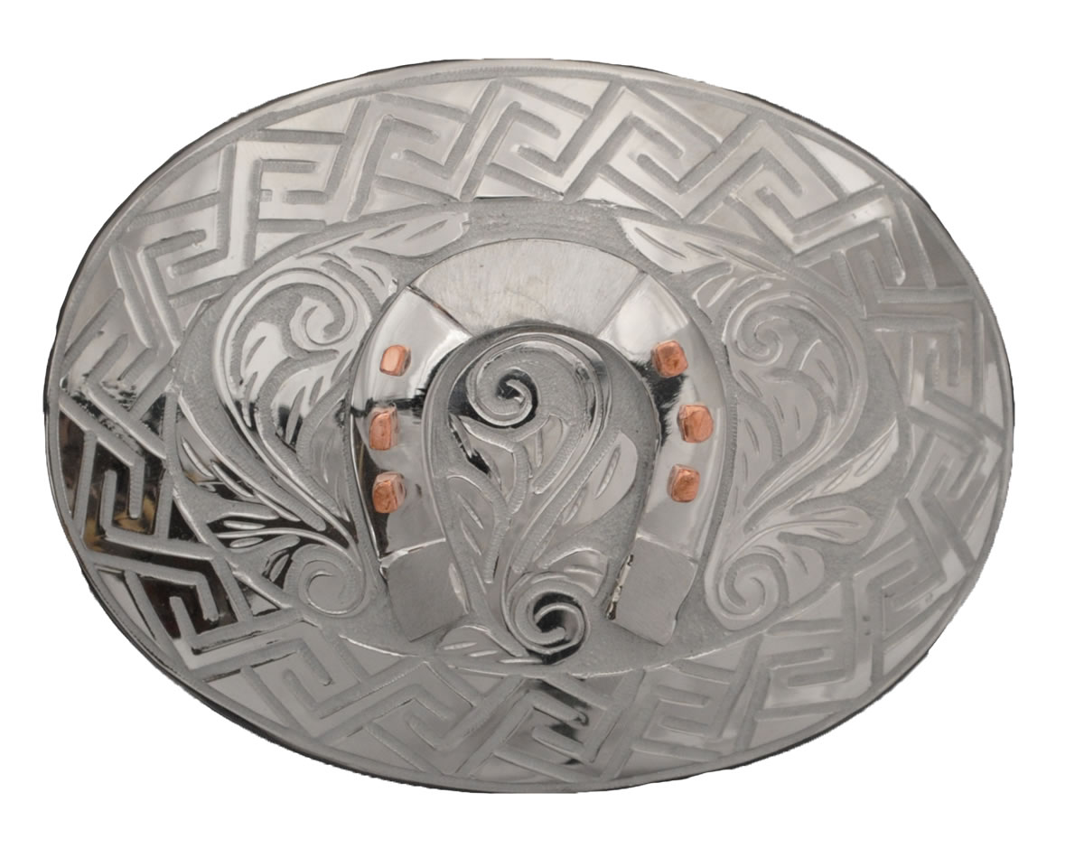 handmade engraving in high relief with figures of frets and a horseshoe, welded with copper pins, leaves and flowers, fits belts up to 2" The design may vary