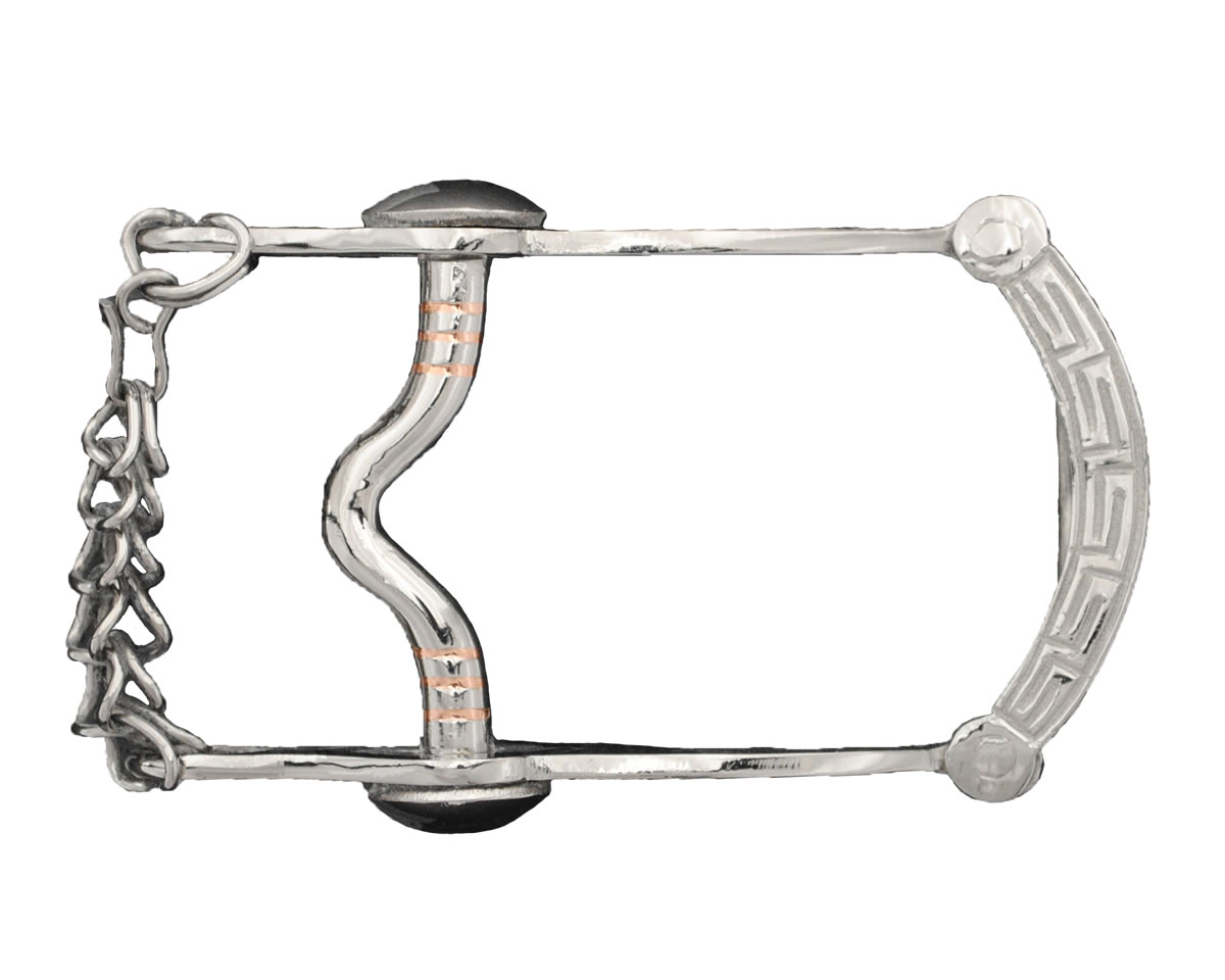 buckle, bit-shaped, simple engraving, with leafe and flower ornaments, fits belts up to 2". Hebilla economica en forma de freno de acero inoxidable grabado