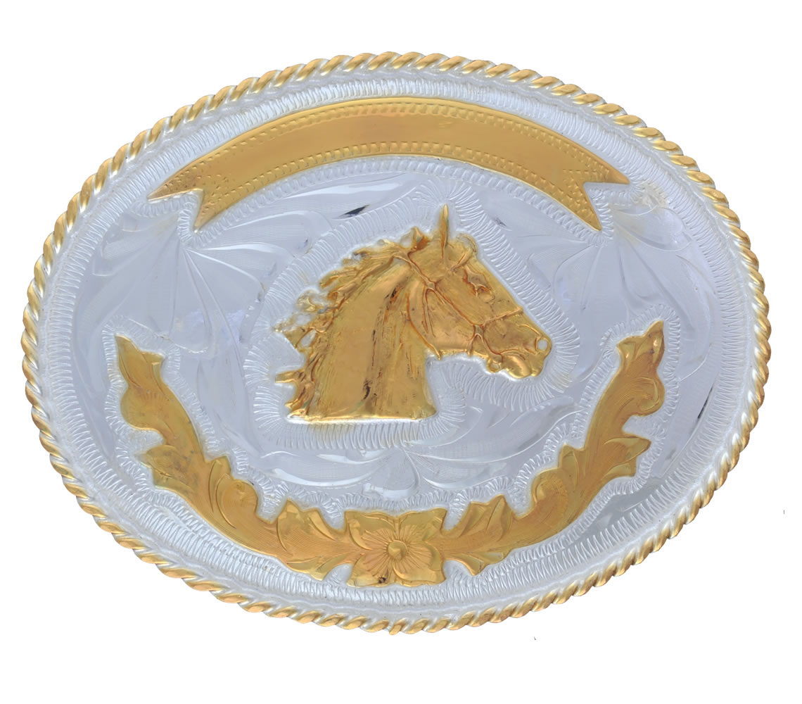 caballo dorado, en alto relieve, la imagen esta sobre puesta y soldada, con ornamentos de hojas y flores trabajadas a mano, quedan hasta 1 3/4" de cinto.