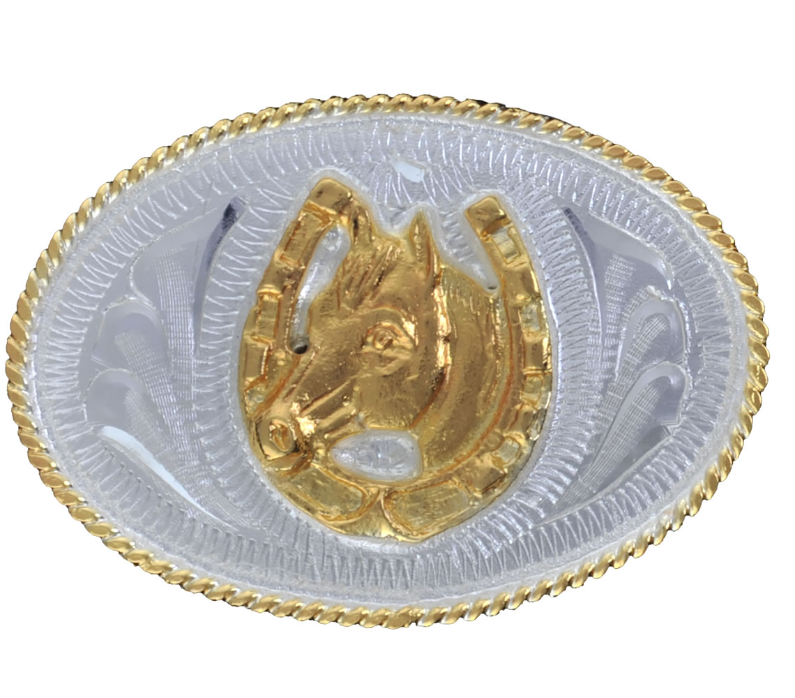 buckle, ridge edge border, bathed in silver, covered with an electrolytic resin, engraved with the image of a horseshoe and a horse head in the middle, in