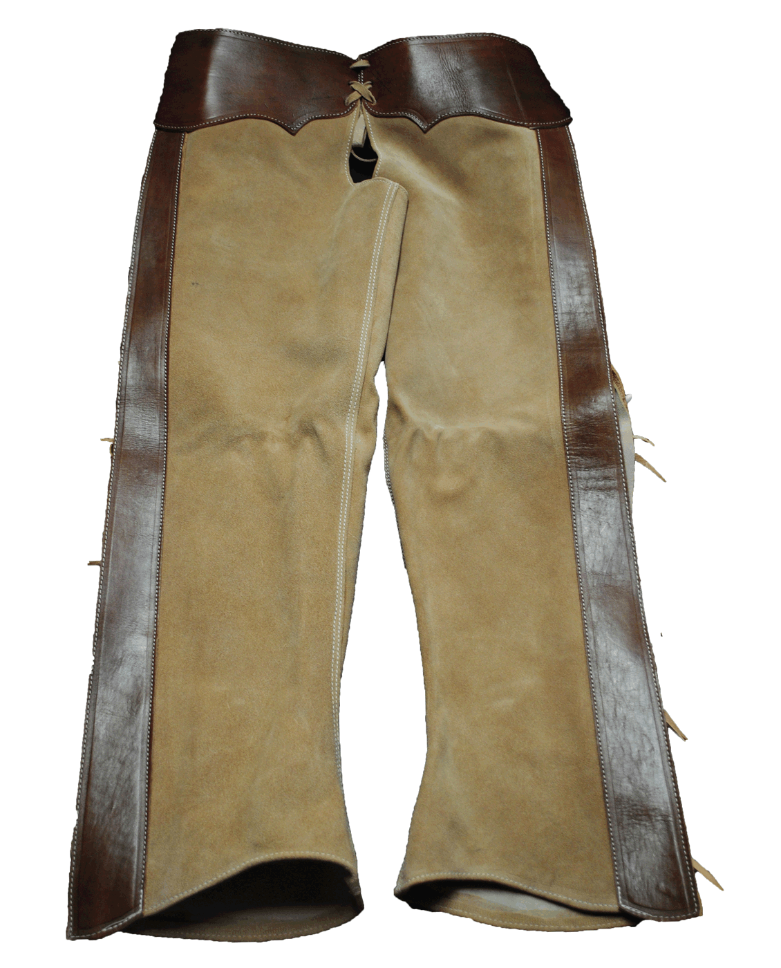 Full regular suede leather chaps with smooth leather applications. Caparrera regular de cuero gamuza con aplicaciones de