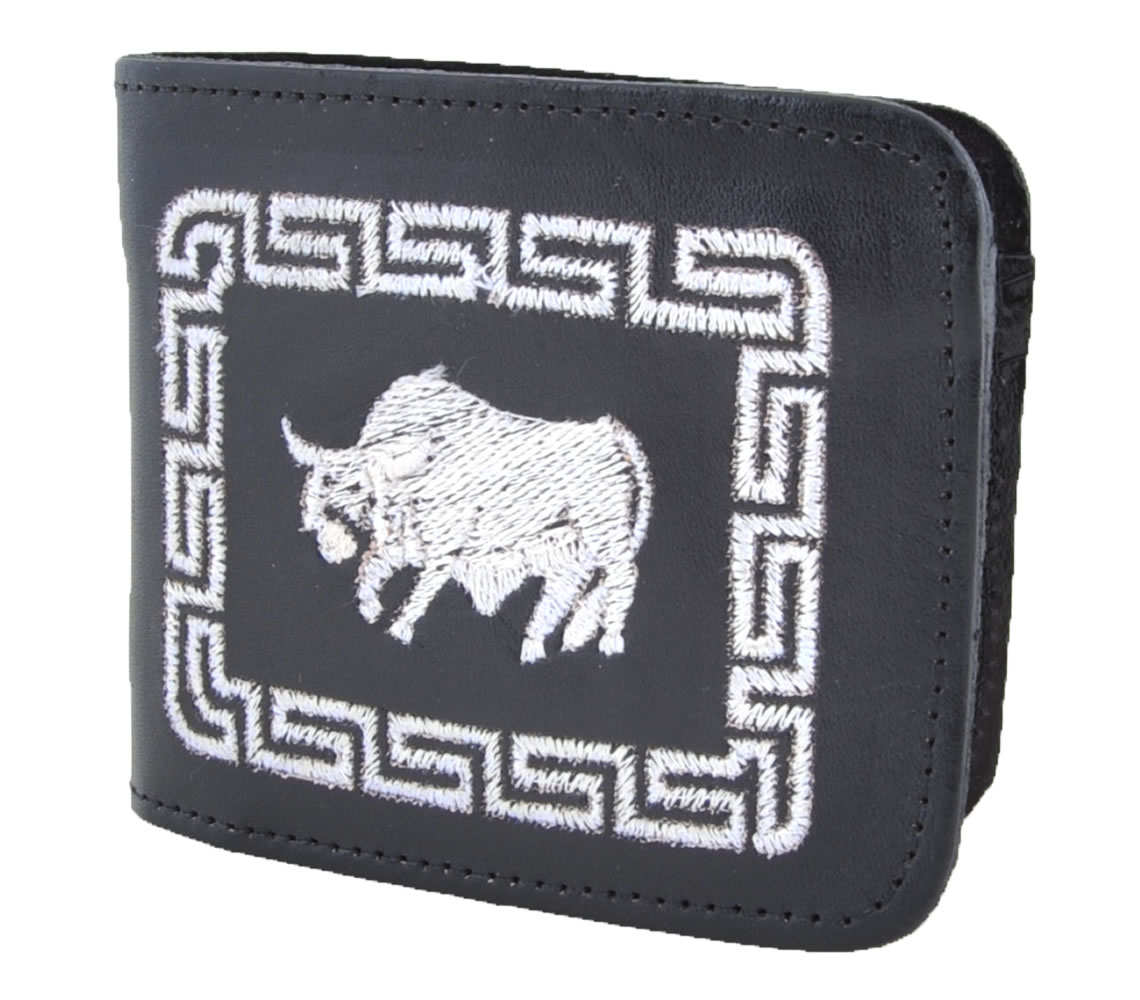 bull with frets. Cartera fina de cuero de res bordado a maquina la imagen es de un toro con grecas, de un doblez.