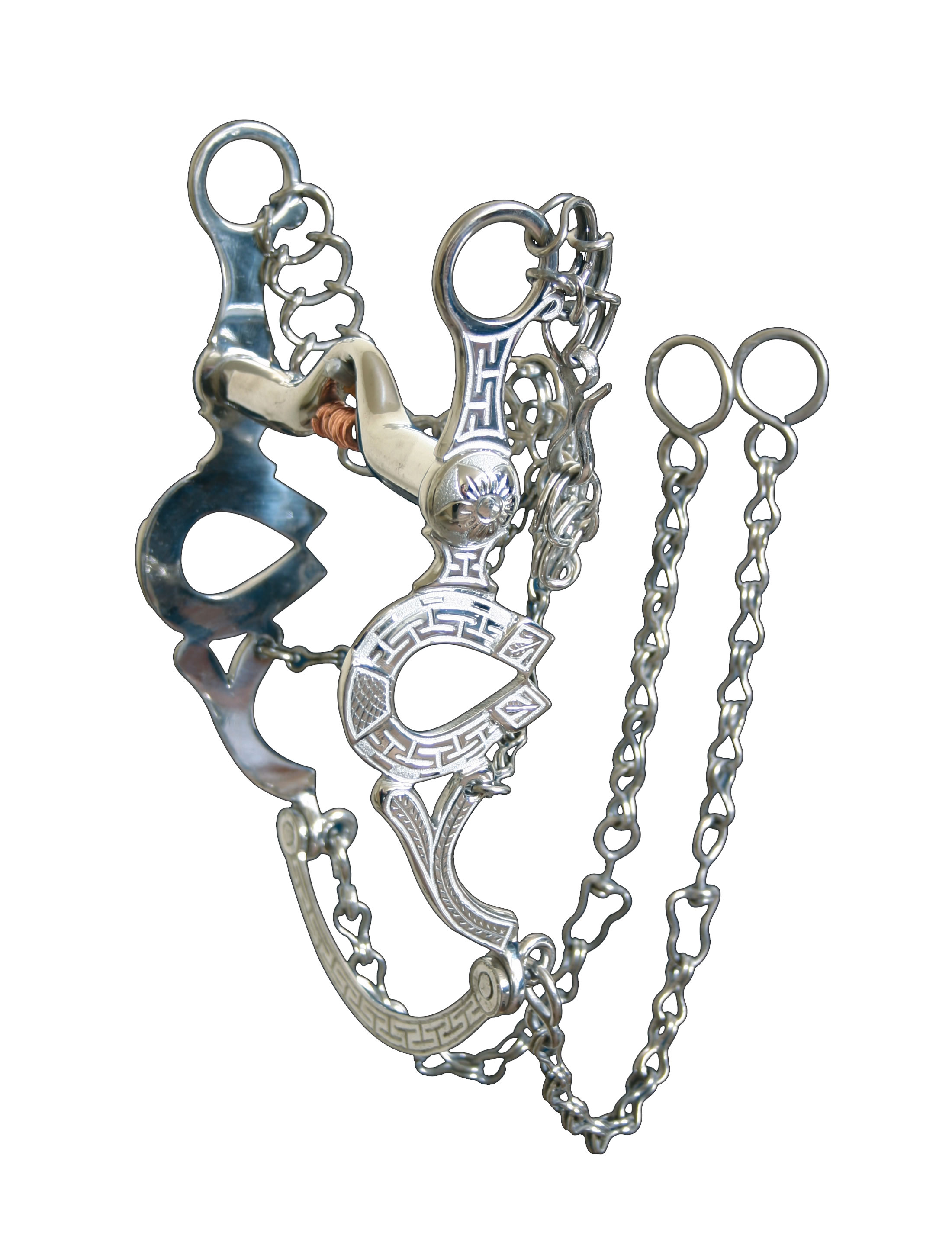 Freno de acero inoxidable para charreria bocado de acero tambien con sabor de cobre cincelado y gravado a mano con figura de herrajes con grecas en alto relieve.
