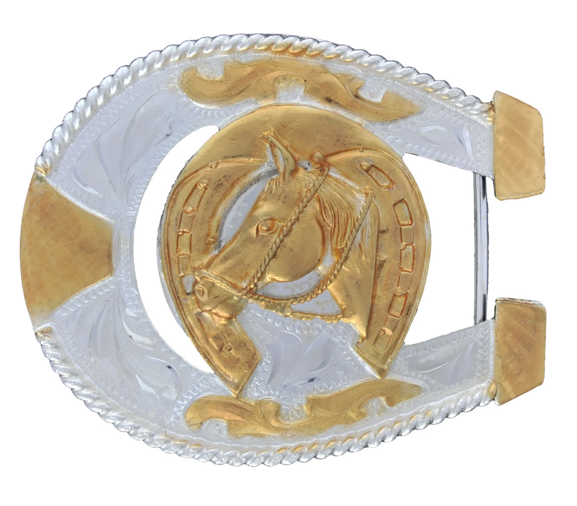 buckle, horseshoe-shaped, type Mariachi, bathed in silver and covered with an electrolytic resin, engraved with an image of a horseshoe and a horse head