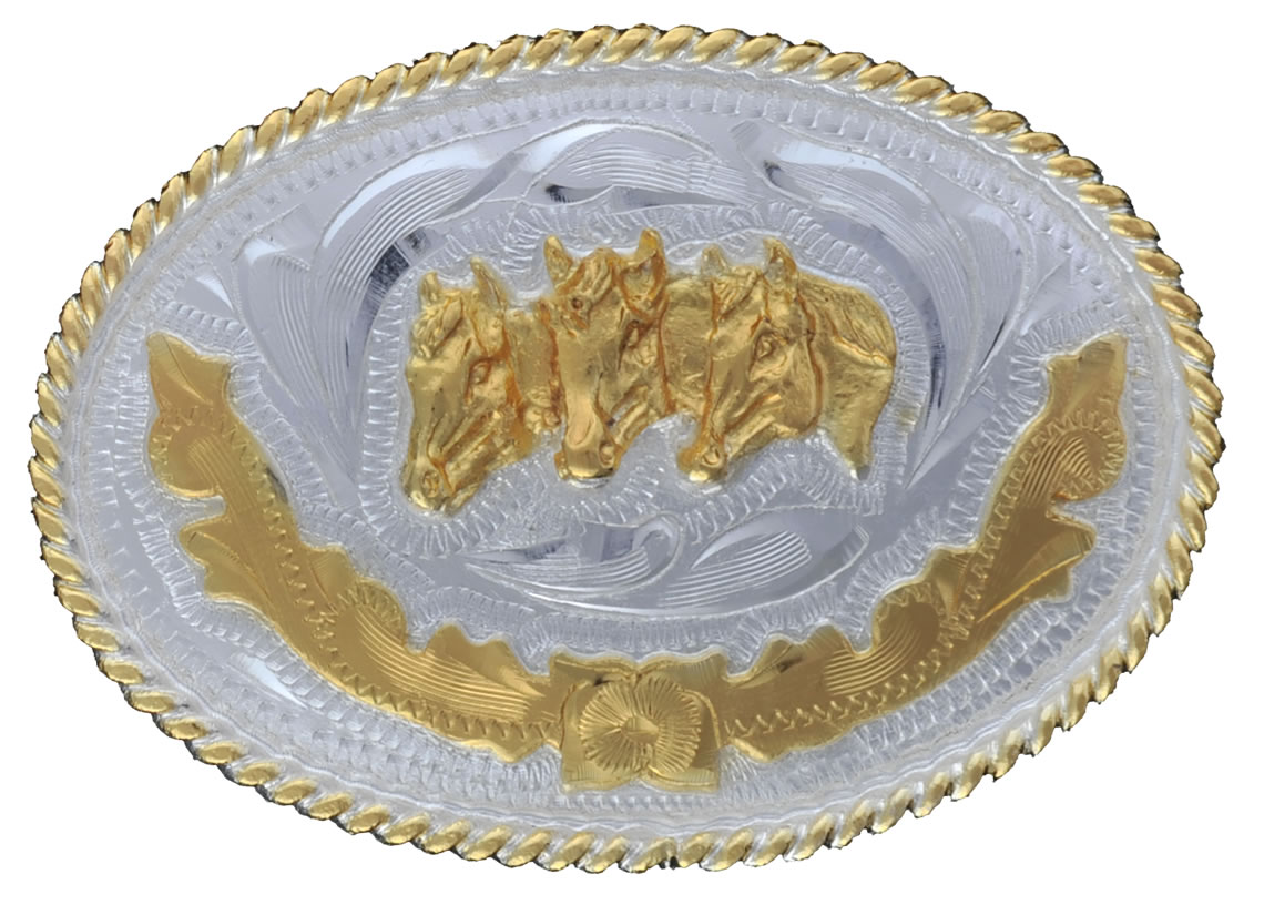 edge border, bathed in silver, covered with an electrolytic resin, engraved with the image of 3 horse heads, in high relief, golden, welded and overlaid,