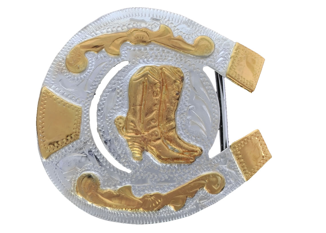 Horseshoe-shaped Alpaca buckle, bathed in silver, covered with an electrolytic resin, engraved with the image of two cowboy boots, in high relief, golden,